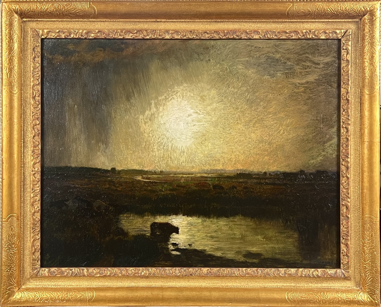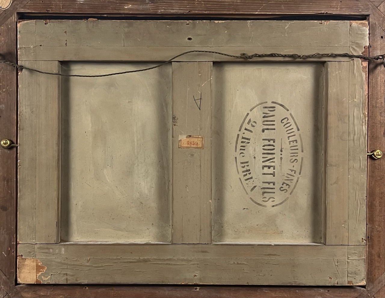Cette peinture à l’huile d’Émile René Ménard est une variante du pastel La Mare réalisé en 1912, identifié par sa reproduction dans Peintures et pastels de René Ménard (Librairie Armand Colin, 1923). D’après ses carnets[1], dans lesquels il consignait sa production mois par mois, l’artiste a réalisé sept versions de cette composition entre juillet 1911 et septembre 1912, parmi lesquelles six peintes à l’huile et une réalisée au pastel. L’étiquette de la galerie parisienne Allard au dos de notre version et son format permettent d’identifier celle-ci comme datant d’août 1912 et de lui rendre son titre : La Mare soleil couchant.
